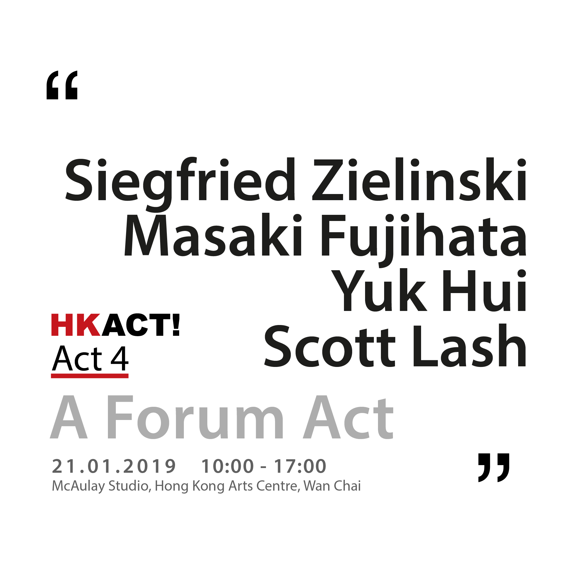 Speakers: Siegfried Zielinski, Masaki Fujihata, Yuk Hui, Scott Lash HKACT! Act 4 “A Forum Act”, a one-day forum organized by Osage Art Foundation under its HKACT! (Hong Kong Art Culture and Technological Innovation) platform, with speakers Prof. Siegfried Zielinski, Prof. Masaki Fujihata, Prof. Yuk Hui and Prof. Scott Lash. The Forum aims to discuss and address the interdependencies between arts, sciences and technologies, and the challenges between ideas of the expanded field of interactive arts. The Forum will be held over two sessions in one day with 4 papers delivered by the 4 speakers. Prof. Zielinski shall discuss the expanded hermeneutics, in which dialogue is becoming a decisive paradigm, a “dialogue between men and machines, between the objects both are generating, between programmes and machines themselves”. Prof. Fujihata shall address the challenges to develop a new literacy and language in the handling and distribution of image media. Prof. Hui shall examine the question of space and place in digital technologies and in artistic creations, in view of Augmented Reality and Virtual Reality. Lastly, Prof. Lash shall discuss the machinic predication and technical imagination, in the context of Gödel’s algorithmic thinking. More information: www.hkact.hk/forumact |